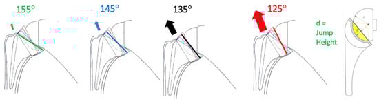 The thickness of the arrows indicates susceptibility to superior–lateral instability with an increasing effective NSA. Illustration of jump height (d) and radius of the glenosphere (r) on the right.