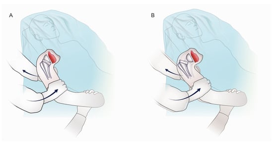 These challenges emphasize the importance of intraoperative testing to comprehensively assess RSA stability. Currently, intraoperative methods for evaluating joint reaction forces and detecting instability are limited []. Tests such as external rotation in the neutral position, abduction/external rotation, and adduction/internal rotation are used to address anterior, posterior, and anterior–superior instability. However, they do not specifically target superior–lateral stability. Other described tests include the “shuck test” (pistoning), “bed shuffle test” (antero-superior instability), and “lateral thrust test” (lateral instability via a non-physiological intra-articular thrust test) []. To address this gap, we propose the two-hand lever test (2HLT), a novel intraoperative method designed to detect superior–lateral instability in RSA with a 135° NSA. This test evaluates stability by simulating superior–lateral forces and by challenging the liner’s jump height through an indirect lever mechanism mimicking physiological upper arm impingement, such as during the compression of the arm against the thorax in some flexion (Figure 2). The 2HLT provides a practical tool for surgeons to identify instability and optimize liner thickness and constraint selection intraoperatively.