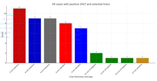 Of 65 RSA cases with the new Perform stem combined with glenoid lateralization after introduction of the 2HLT, 49 cases (75%) were positive, defined as a positive test with a +0 mm standard liner. The 2HLT influenced implant selection in these cases. Testing with the 2HLT commenced after the detection of superior–lateral instability in the ninth case of the series, following the implantation of 16 cases. Figure 4 illustrates the liner types used after a positive 2HLT. The most frequently used liners were retentive liners (30 out of 49 cases, 61%).