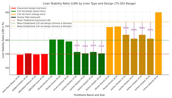 When comparing the new Perform 135° design standard liners with the standard liners of the established 135° designs (Altivate and Univers), a notable stability gap was observed. The mean JH gap was 1.7 mm (range: 1.47–1.92 mm), while the mean LSR gap was 46% (range: 43–48%). The mismatch in the Perform standard liner LSR with the 135° Perform design is illustrated in Figure 6. These findings underscore measurable differences in the biomechanical properties of the new 135° Perform design relative to the established 135° systems. The Perform retentive liners, however, demonstrated LSR values ranging from 185% to 219%, comparable to those of the established 135° design standard liners (195–202%), effectively mitigating the observed JH and LSR gaps and mismatch in the Perform standard liners.