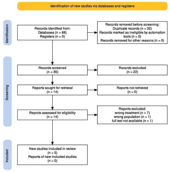 The initial search yielded 68 articles. After removing duplicates using the Rayyan app, 32 articles were screened. Selection based on the title and abstract allowed us to exclude another 22 articles, while the remaining 14 were considered relevant for further evaluation based on full-text reading. Then, seven records were excluded for using the wrong treatment, one for including the wrong population, and one for the unavailability of the full text. Finally, five studies were included in this systematic review. The entire process is represented in a PRISMA Flow Diagram (Figure 1).