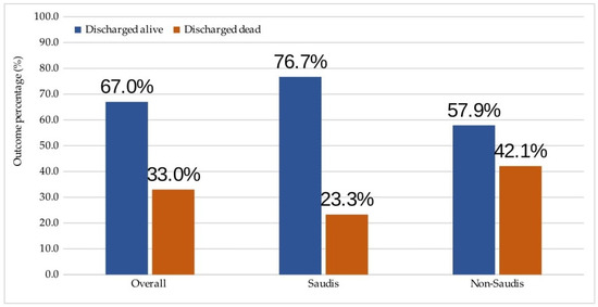 Patient characteristics and outcomes were reported using descriptive statistics. Continuous variables were reported as the means and standard deviations (SDs) or medians and interquartile ranges (IQRs) as appropriate. Categorical variables were reported as counts and percentages. We stratified the population into Saudi and non-Saudi populations to assess differences in characteristics and outcomes using Student’s t-test, the Mann–Whitney U test, and the X2 test, as appropriate.