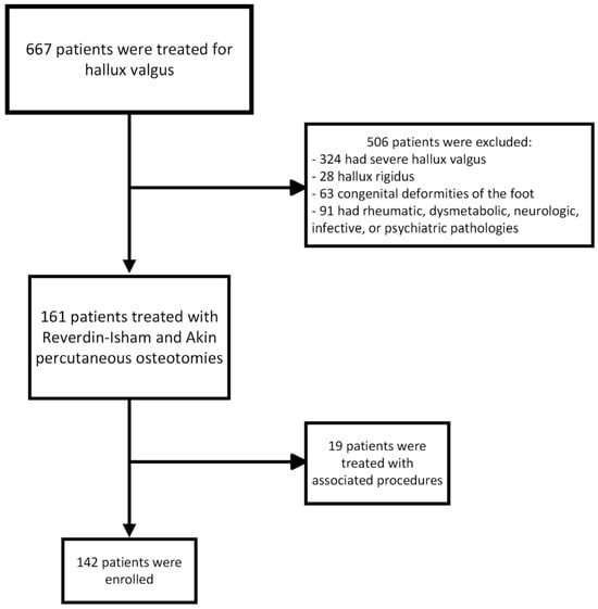 Patients treated with other techniques or who underwent correction of other foot deformities correlated with HV in the same surgical session were excluded from the study. Other exclusion criteria were congenital deformities of the foot, hallux rigidus, personal history of traumatic or surgical injuries to the affected foot and ankle and the presence of rheumatic, dysmetabolic, neurological, infective or psychiatric pathologies. The study was approved by the Local Ethics Committee of Hospital-University of Padova (protocol code 4064/AO/17). It was conducted according to good clinical practice guidelines and the ethical standards of the 1964 Declaration of Helsinki as revised in 2013. All patients received a thorough explanation of the risks and benefits of inclusion and gave their written informed consent to be included in the study.