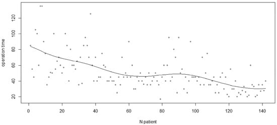 In Figure 4, the non-parametric estimation of the learning curve (operation time as a function of the number of patients treated) of the surgeon is reported [30]. Considering the period corresponding to the last twenty to thirty patients, it seems that the performance of the surgeon has stabilized.