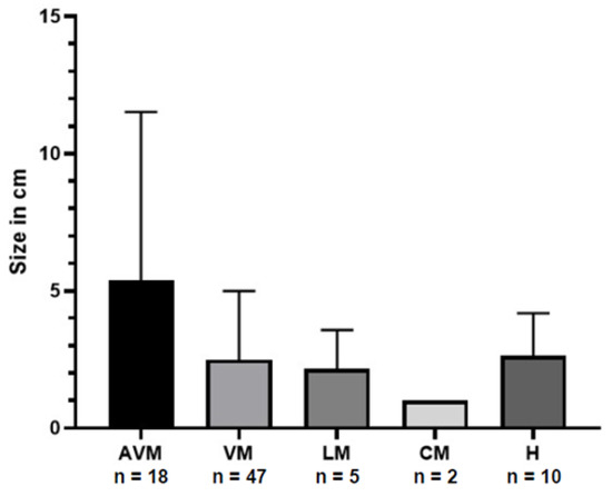 Distribution of the size of vascular anomaly in centimetres (bars represent the standard deviation) grouped by type of malformation. AVM = arterio-venous malformation; VM = venous malformation; LM = lymphatic malformation; CM = capillary malformation; H = haemangioma.