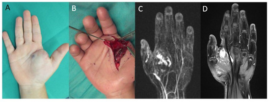Right hand of a five-year-old female patient with an arterio-venous malformation of the right hand with diffuse intermuscular invasion: (A) blue discoloration and swelling in the palm and thenar region of the right hand; (B) intraoperative image of the arterio-venous malformation; (C) contrast-enhanced MR-angiography shows an arterio-venous malformation of the palm and thenar region of the right hand; (D) MRI of a recurrence of the arterio-venous malformation 6 years after surgical resection.