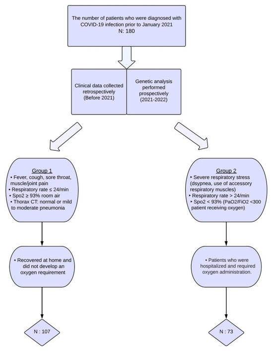 A total of 180 subjects diagnosed with COVID-19 were recruited from the adult outpatient clinic of the Hacettepe University, Department of Chest Diseases, from December 2021 to September 2022. The participants were retrospectively categorized into two groups based on their disease course history during the COVID-19 pandemic. In order to conduct prospective genetic polymorphism analyses, venous blood samples were collected following the acquisition of written informed consent. The 107 patients who had mild disease comprised Group 1, whereas the 73 individuals with severe illness comprised Group 2. Figure 1 presents the criteria used to determine COVID-19 severity. Furthermore, the study did not include individuals who contracted the disease during the emergence of virus variants in 2021. Therefore, the study findings were not influenced by the impact of the viral variants on the disease course. This study also excluded environmental factors such as air pollution, seasonal variations, and the geographical locations of patients’ residences, as these were difficult to standardize and would further restrict patient selection.