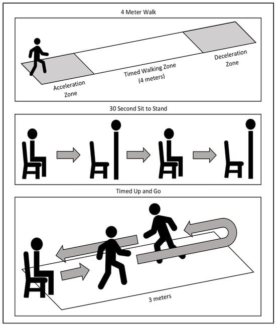 Functional tests illustrations; from top to bottom, the 4-m walk test, 30 s sit-to-stand test, and time up and go test are demonstrated.