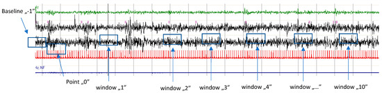 Illustration of PLMS occurring in a series. Point ‘0’ denotes the onset of the first PLMS event in the sequence. Time windows (1–10) correspond to segments of 10 RR intervals following each subsequent PLMS event (1–10). Window “…” illustrates windows 5–9. The baseline is defined as the 10 RR intervals preceding the initiation of the series. For each RR interval within the baseline and time windows, values for HR, SBP, DBP, and HF-HRV were calculated, and the baseline values for HR, SBP, DBP, and HF-HRV were assessed.