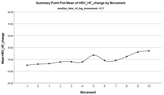 Summary of the mean change in HF-HRV during PLMS with leg movements lasting <2.1 s. The vertical axis represents the mean change in HF-HRV, calculated as the difference between each HRV value and the mean HRV before the limb movement. The horizontal axis indicates the movement series, with ‘−1’ marking the time immediately before the start of the movement and ‘0’ indicating the beginning of the movement. ‘Movement’ on the x-axis refers to leg movement.
