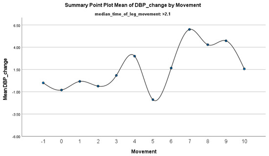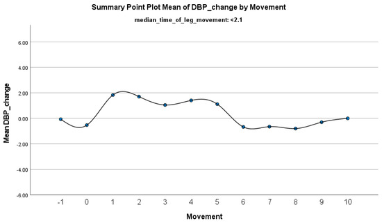Summary of the mean change in DBP during PLMS with leg movements lasting >2.1 s. The vertical axis represents the mean change in DBP, calculated as the difference between each DBP value and the mean DBP before the limb movement. The horizontal axis indicates the movement series, with ‘−1’ marking the time immediately before the start of the movement and ‘0’ indicating the beginning of the movement. ‘Movement’ on the x-axis refers to leg movement.