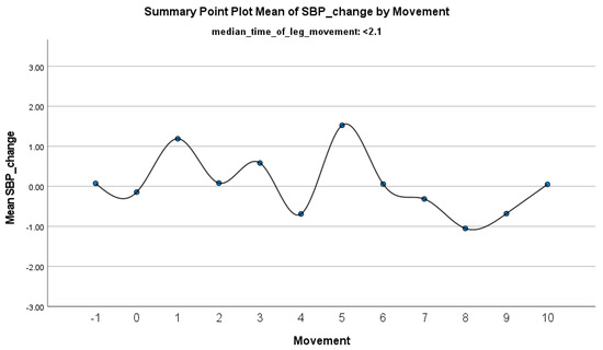 Summary of the mean change in SBP during PLMS with leg movements lasting <2.1 s. The vertical axis represents the mean change in SBP, calculated as the difference between each SBP value and the mean SBP before the limb movement. The horizontal axis indicates the movement series, with ‘−1’ marking the time immediately before the start of the movement and ‘0’ indicating the beginning of the movement. ‘Movement’ on the x-axis refers to leg movement.