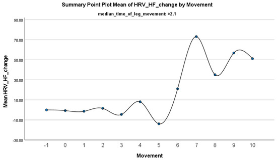 Summary of the mean change in HF-HRV during PLMS with leg movements lasting >2.1 s. The vertical axis represents the mean change in HF-HRV, calculated as the difference between each HRV value and the mean HRV before the limb movement. The horizontal axis indicates the movement series, with ‘−1’ marking the time immediately before the start of the movement and ‘0’ indicating the beginning of the movement. ‘Movement’ on the x-axis refers to leg movement.
