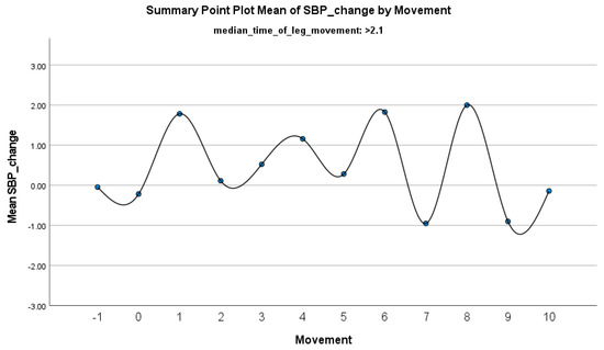 Summary of the mean change in SBP during PLMS with leg movements lasting >2.1 s. The vertical axis represents the mean change in SBP, calculated as the difference between each SBP value and the mean SBP before the limb movement. The horizontal axis indicates the movement series, with ‘−1’ marking the time immediately before the start of the movement and ‘0’ indicating the beginning of the movement. ‘Movement’ on the x-axis refers to leg movement.