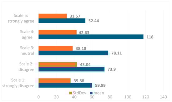 Evaluating the trend in responses regarding patients’ access to health services during the COVID-19 pandemic, the general perception of the majority of respondents was represented by the need to develop and implement alternative solutions, such as the use of telemedicine services, to increase the accessibility of vulnerable groups of patients to health services—a fact demonstrated by their selecting a value of 4 on the Likert point scale (IQR 4.0–5.0, scale 1 [not at all] to 5 [very much], with a mean of 118 and a standard deviation of ±42.63), representing the agreement of healthcare professionals based on patients’ needs regarding the use of telemedicine (Figure 2).