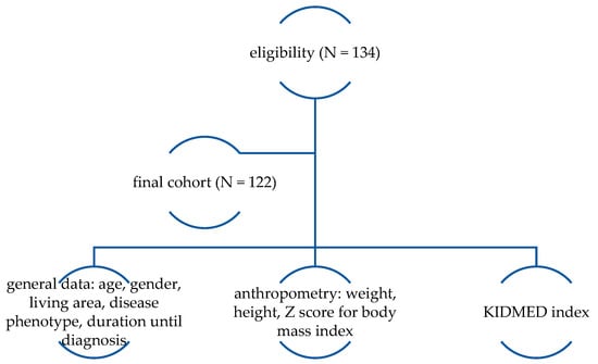 Variables. Data collected in this study included general information: age at diagnosis (years), gender (male/female), living area (rural/urban), anthropometry assets at diagnosis (weight, height, Z score for body mass index), disease phenotype according to the Paris classification (ulcerative colitis, Crohn’s disease), and the KIDMED index regarding healthy eating. Patients with indeterminate IBD were excluded from the study. Figure 1 shows the flowchart of the investigation.