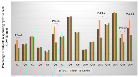 When analyzing the proportion of responders in the total sample with “yes” for each item of the KIDMED score, meaning marked with +1, adjusted for baseline diagnosis, we found out that Q 1 (“Has a fruit or fruit juice every day”) and Q15 (“Has two yoghurts and/or some cheese (40 g) daily”) showed a higher percentage of “yes” answers in IBD patients compared to FAPDs subjects (p < 0.05), meaning 29.3 vs. 18.4, and 38.5 vs. 26.3, respectively (Figure 1). Other significant differences, adjusted for baseline diagnosis and KIDMED index groups, were for questions Q6 (“Goes more than once a week to a fast-food (hamburger) restaurant”), Q12 (“Skips breakfast”), and Q16 (“Has sweets and candy several times every day”), showing that FAPDs patients responded more frequently with “no”, meaning better eating habits, the percentage being 26.2 vs. 48.9, 33.2 vs. 58.4, and 36.7 vs. 58.8, respectively (Figure 2).