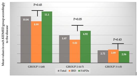 In the same KIDMED index group, mean values were higher for FAPDs patients, but results differ statistically significantly only for “medium” adherence to MD, showing that larger proportion of IBD patients were previously exposed to non-healthy diets: 8.99 vs. 11.1, p = 0.45, 5.02 vs. 6.92, p = 0.05, 2.89 vs. 2.56, p = 0.43, for group 1, 2, and 3, respectively (Figure 3).