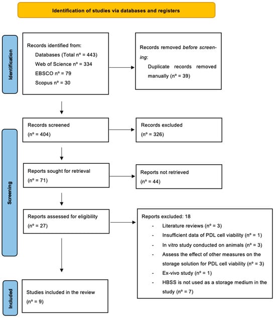 From the initial search, a total of 443 articles were obtained from the mentioned databases: Web of Science (n = 334), EBSCO (n = 79), and Scopus (n = 30). After having carried out the initial search, the next step involved was to remove duplicated records prior to screening, which was carried out manually, and a total of 39 duplicates were found and subsequently removed. Next, a preliminary screening was carried out, which involved reading the article titles, and those that did not meet the inclusion criteria or were not relevant to the topic were removed. This equated to the removal of 326 articles in total. Following this, 71 records were sought for retrieval, which involved reading the abstract of the article that provided an overview of the introduction, materials and methods, results, and conclusion of the selected article. After having read these 44 articles, they were removed as they were considered irrelevant, or they did not answer the PICO question. Afterwards, a more in-depth assessment of the remaining 27 articles was carried out, which involved a thorough and extensive reading of the whole article text. Those articles that were not eligible for the analysis were removed and excluded. The reasons for the exclusion of these articles were due to three of them being systematic reviews, which was not realized until the in-depth reading of the work; another three studies were conducted on animals that made up part of the exclusion criteria; three other studies conducted investigations on other variables that did not include PDL cell viability following storage, namely these were the effect of temperature, clonogenic capacity, and cell apoptosis. In addition, one study did not provide any data on cell viability following storage, and another study had to be excluded because it was an ex vivo experiment. The last seven studies excluded were due to the fact that HBSS was not used as a storage medium in the studies.
