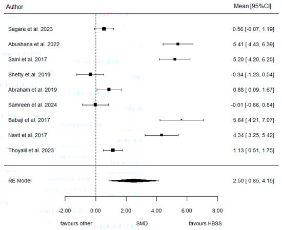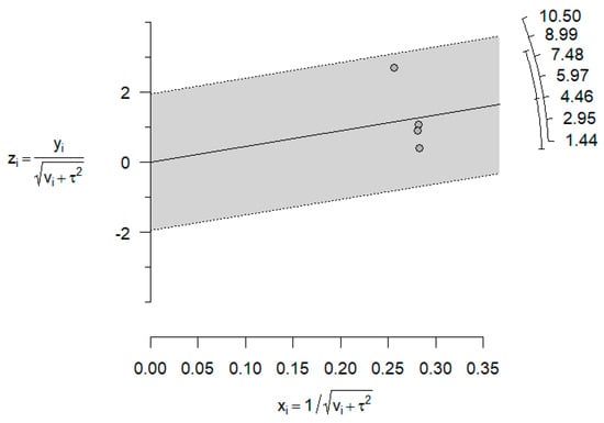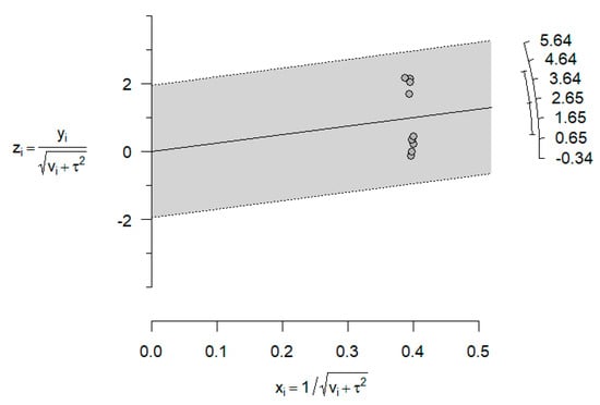 Again, the heterogeneity, observed in Table 8, was estimated at a high level of 96.7%, with Babaji (2017) [22] showing a benefit of HBSS that is very large compared to other authors. Additionally, the absence of publication bias was rejected (p > 0.001) as seen in the funnel plot (Figure 6) below for model 2. Additionally, the Galbraith’s plot seen in Figure 7 suggests a slight trend in effect sizes, but the confidence band includes zero, indicating that whilst some heterogeneity may exist, there is no strong evidence of significant small-study bias in the meta-analysis.