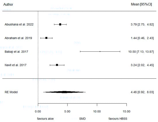 Moreover, the forest plot below for model 2 (Figure 5) graphically displays the estimated results of the meta-analysis. The meta-analysis concluded the SMD to be 4.48 in this case (95% CI: 0.92, 8.03), which again does not cross 0, therefore indicating a strong statistically significant trend (p-value = 0.014). This significance also confirms that HBSS provides significantly better preservation than aloe vera.