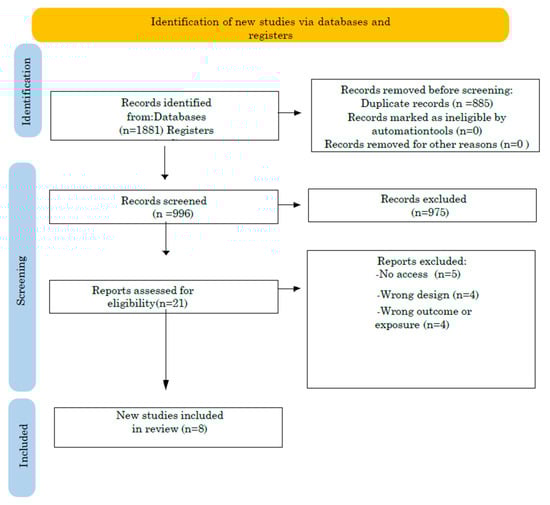 The initial database searches yielded a total of 1881 records. After the removal of 885 duplicate entries, 996 titles and abstracts were screened for relevance. Of these, 21 full-text articles were assessed for eligibility based on the predefined inclusion and exclusion criteria. Thirteen studies were excluded during the full-text review due to reasons such as insufficient methodological detail or the use of observational study designs without an intervention component. Ultimately, eight studies were included in the final analysis (see Figure 1 for the PRISMA flow diagram). The majority of the selected studies were conducted in Japan [,,,,,,], with one study originating from Finland [].