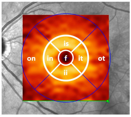 Early Treatment Diabetic Retinopathy Study (ETDRS) grid projected over the segmented macular ganglion cell layer of a healthy individual in spectral-domain optical coherence tomography (SD-OCT). Note the thick doughnut-shaped region of ganglion cells surrounding the fovea. The inner circle ganglion cell layer thickness (GCLTi) value contains the mean thickness (in µm) of the four inner sectors (in: inner nasal; is: inner superior; it: inner temporal; ii: inner inferior). The GCLT distribution per sector over the entire horizontal grid was focused on in the very early post-symptomatic phase, including the sectors on: outer nasal; f: foveal; and ot: outer temporal.