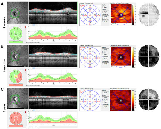 Imaging and visual field of the left eye of a 25-year-old Leber hereditary optic neuropathy (LHON) patient with m.11778G→A mutation during the first year after the onset of symptoms. Analysis of retinal nerve fibre layer (RNFL) and macular ganglion cell layer thickness (GCLT) by spectral-domain optical coherence tomography (SD-OCT, Heidelberg Engineering, Heidelberg, Germany) and Humphrey visual field (30-2, Analyser 3, Zeiss, Jena, Germany) are shown from left to right for three time points. (A) Two weeks after symptom onset, there was subtle swelling of the peripapillary RNFL, but already reduced GCLT in all sectors, particularly in the nasal foveal region. Centrocecal scotoma was present, and the visual acuity was 0.80 log MAR at this time. (B) At four months, the RNFL was partially reduced, especially in the temporal region, but there were hardly any ganglion cells visible in the colour image of the GCLT analysis. Almost complete loss of the central visual field was observed over the months. (C) One year after the onset of symptoms, circular atrophy of the RNFL and further reduction in the GCLT were observed with visual field depression, showing enlarged fenestration in the upper visual field.
