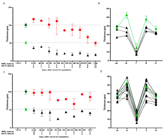 (A,C) Development of global retinal nerve fibre layer thickness (RNFL, red dots) and inner ring macular ganglion layer thickness (GCLTi, black triangles) in patients with Leber hereditary optic neuropathy (LHON, (A)) or optic neuritis (idiopathic single isolated ON (SION) and MS-associated ON, (C)). Comparison with healthy subjects (green symbols) was conducted using spectral-domain optical coherence tomography (SD-OCT, Heidelberg Engineering, Heidelberg, Germany). RNFL swelling was observed in LHON patients during the first 90 days after symptom onset. Subsequently, RNFL thickness decreased during the first year. Already in the first 45 days after symptom onset, the GCLTi is significantly reduced compared to healthy subjects (A). Substantial thinning of the RNFL occurs after 91–120 days in ON patients. The GCLTi is less reduced over time compared to LHON but is also noticeable in the very early phase 0–45 days (C). (B,D) The five horizontal GCLT sectors at 0–45 days are shown for four LHON eyes (B) and 13 ON eyes (D) (black triangles) compared to healthy subjects (green triangles). The GCLT is prematurely thinned in all LHON eyes, especially with a large delta to normative values in the inner nasal segment of the ETDRS grid (B). There are variable differences in ON patients compared to healthy controls (D). (A–D) The underlying normative values for the thickness of the global RNFL, the GCLTi, and the five horizontal sectors are taken from the study by Storp et al. based on data from 501 eyes of healthy subjects [18]. Values are presented as the median and interquartile range.