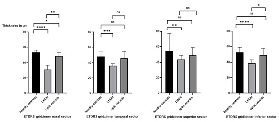 Statistical evaluation of the inner nasal and inner temporal sectors is shown in Figure 4. The GCLT of the inner nasal sector of the ETDRS grid was significantly decreased in LHON compared to healthy controls and ON patients. The inner superior sector was significantly reduced in LHON patients compared to healthy controls. The inner inferior sector was significantly reduced in LHON patients compared to healthy controls and ON patients. No difference was found between healthy controls and ON patients.