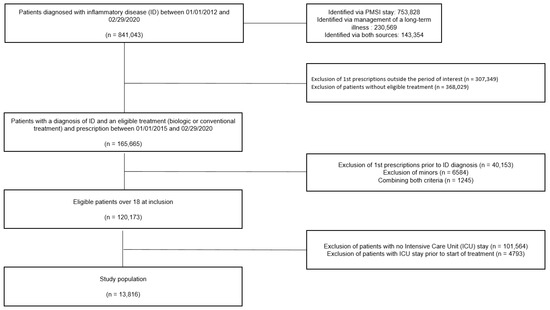 To be included, patients had to have had (i) at least one hospitalization or long-term health condition with a diagnosis of inflammatory disease coded as such between 2012 and 29 February 2020, (ii) at least one administration of SCT or biological after the first diagnosis of inflammatory disease between 2015 and 29 February 2020 (inclusion index date), and (iii) a stay in an intensive care unit after the inclusion date (Figure 1).