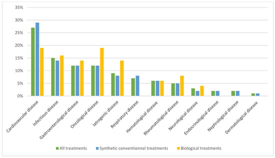 In the SCT group, 312 patients died. The main causes of death were also cardiovascular, infectious, and gastroenterological. In the biological treatment group, 49 patients died, with oncological, cardiovascular, and infectious causes predominating.
