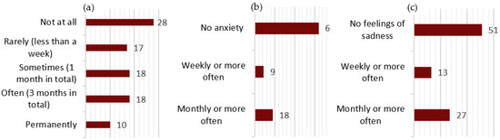 About one third of the patients (31.86%) considered themselves to be stressed for more than 3 out of 6 months or even permanently, 34 of the patients (37.36%) said that they were sometimes or rarely stressed, and the rest (30.77%) were not stressed (Figure 1a). Symptoms that suggest panic attacks were experienced by 29.67% of patients, 66.66% of whom reported panic attacks on a weekly basis (Figure 1b). Feelings of sadness, depression, hopelessness, loneliness, or loss of interest in social interaction were present in almost half (43.95%) of the patients in the group, with a third (32.50%) of them reporting their presence weekly or more often (Figure 1c).