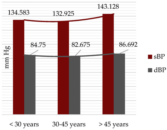 Stratifying by age group, the mean sBP and dBP values were calculated. Patients aged 30–45 years had the lowest values (sBP = 132.83 mmHg, dBP = 82.68 mmHg), whereas those over 45 years had the highest values, with means exceeding the maximum accepted normal values (sBP = 143.13 mmHg, dBP = 86.69 mmHg), but not with statistical significance (Figure 3).