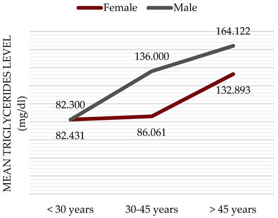 The mean HDL-cholesterol value was 56.66 ± 14.93 mg/dL, with most patients having normal values. According to reference values, twenty-one women (30.88%) had HDL-C values < 50 mg/dL, and three men (13.04%) had HDL-C values < 40 mg/dL, placing them at major cardiovascular risk. Regarding triglyceride levels, an increase in the mean value was observed in direct proportion to the age of the patients. Patients under 30 years of age had the lowest mean value (82.39 ± 21.56 mg/dL), while those over 45 years of age had a mean value of 140.10 ± 95.79 mg/dL, and this was statistically significant (p < 0.05). When dividing the group by sex and age, an approximately linear increase in mean triglyceride values was observed in men, whereas a sharp increase in triglycerides occurred among women after the age of 45 years (Figure 4).