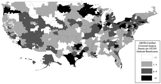 We grouped the HRRs by the density of active, board-certified colon and rectal surgeons in 2014 using certification data provided by the American Board of Colon and Rectal Surgery (ABCRS) active roster of diplomates; this active roster from 2015 provided addresses and certification data for each member. We excluded the 88 surgeons that were certified in 2015 or not practicing in the United States, which left 898 active, ABCRS-certified colon and rectal surgeons that were practicing in the United States. We assigned members to their respective HRRs by the 2014 Dartmouth Atlas zip code to the HRR crosswalk file, which associates zip codes with their respective HRRs (Figure 1).