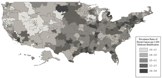 The prevalence of rectal cancer was 57,499 in the 27,767,493 Medicare beneficiaries (MBs) in 2014. The rates of rectal cancer ranged from 1.01 to 3.56 per 1000 MBs, as illustrated in Figure 2.