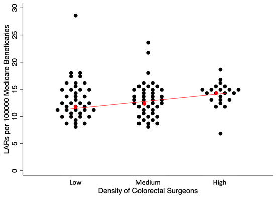 We also found a lower intragroup variation in LAR rates with higher concentrations of colon and rectal surgeons, suggesting rectal cancer patients may have been more likely to be treated by surgeons with a more homogenous practice pattern—in this case, colon and rectal surgery specialists. Longstanding patterns of referral to non-colorectal surgeons performing rectal cancer surgery likely have a greater influence on the regional variation in regions with a low colon and rectal surgeon density over high-density ones. Another reason for the lower intragroup variation may have been due to the development of a “regional standard for rectal cancer treatment” among all the surgeons treating rectal cancer, both colon and rectal and non-colon-and-rectal surgeons, with an increasing colon and rectal surgeon density [24,25,26].