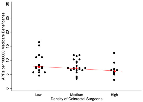 Rates of APRs per 100,000 Medicare beneficiaries by HRRs differentiated by the density of ABCRS-certified colon and rectal surgeons. Each dot represents an HRR that performed at least 11 APR operations in 2014 in the turnip plot. Red dot represents the median HRR rate with the red line showing the general trend based on density of colorectal surgeons. This figure demonstrates that with the increasing density of ABCRS-certified colon and rectal surgeons, there was a decrease in the rate of APRs per 100,000 Medicare beneficiaries. In addition, there was a decreased variability in the rates of APRs per 100,000 Medicare beneficiaries due to the tighter clustering of the dots as the colorectal surgeon density increased.