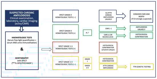 Cardiovascular magnetic resonance, with its unique ability to provide detailed anatomical and morphological information along with tissue characterization, holds great significance in the non-invasive diagnosis of CA. In the proposed diagnostic algorithm provided by the European Society of Cardiology Working Group on Myocardial and Pericardial diseases, CMR should be considered for patients with negative hematologic tests and grade 0 scintigraphy, if suspicion of CA persists, and in patients with positive hematologic tests and grade 0 scintigraphy, to detect cardiac involvement in AL [2].