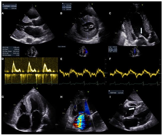 - Habib, G.; Bucciarelli-Ducci, C.; Caforio, A.L.P.; Cardim, N.; Charron, P.; Cosyns, B.; Dehaene, A.; Derumeaux, G.; Donal, E.; Dweck, M.R.; et al. Multimodality Imaging in Restrictive Cardiomyopathies: An EACVI Expert Consensus Document in Collaboration with the “Working Group on Myocardial and Pericardial Diseases” of the European Society of Cardiology Endorsed by the Indian Academy of Echocardiography. Eur. Heart J. Cardiovasc. Imaging 2017, 18, 1090–1091. [Google Scholar] [CrossRef]