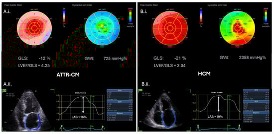 Advanced echocardiographic red flags in ATTR-CM (A.i.,A.ii.) versus hypertrophic cardiomyopathy (HCM) patients (B.i.,B.ii.). (A.i.) Bull’s eye plots of left ventricular global longitudinal strain (GLS) and myocardial work index (MWI) in an ATTR-CM individual demonstrating an apical sparing pattern versus (B.i.) the respective Bull’s eye plots of a HCM individual demonstrating reduced left ventricular GLS and MWI of the hypertrophic interventricular septum. (A.i.) and (B.i.) LVEF/GLS ratio is higher in CA compared to HCM (cut-off value LVEF/GLS ratio > 4.1 to diagnose CA with 89% sensitivity and 91% specificity) [55]. (A.ii.) Left atrial strain (LAS) analysis of the ATTR-CM patient versus (B.ii.) the respective LAS analysis of the HCM patient, indicating the lower peak values of left atrial reservoir (LASr) and contractile strain characterizing ATTR-CM. ATTR-CM: transthyretin amyloid cardiomyopathy, CA: cardiac amyloidosis, GLS: global longitudinal strain, HCM: hypertrophic cardiomyopathy, LAS: left atrial strain, LASr: left atrial reservoir strain, LVEF: left ventricular ejection fraction, and MWI: myocardial work index.