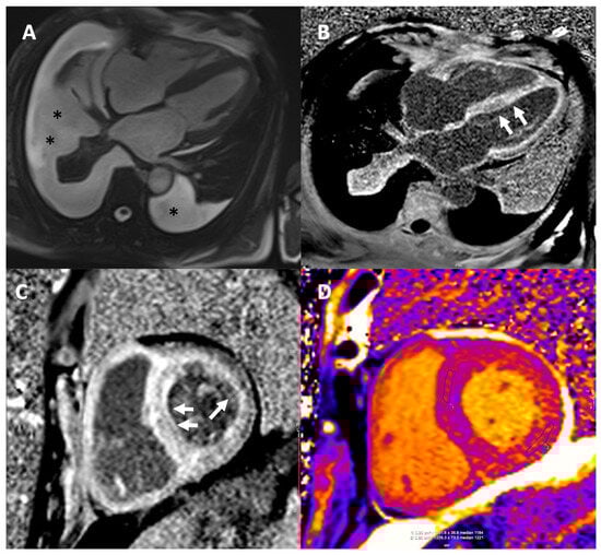 CMR in a patient with CA. (A) End-diastolic frame from horizontal long axis cine demonstrating left ventricular hypertrophy (LVH) and pericardial and pleural effusions (black asterisks *). (B,C) Late gadolinium images in the horizontal long axis (B) and mid short axis (C) showing the characteristic diffuse subendocardial/transmural myocardial enhancement (white arrows) and dark blood pool. Infiltration of the right ventricle, atrial walls and papillary muscles is also seen. (D) Modified Look Locker Inversion Recovery Native T1 Mapping showing markedly elevated T1 times in all myocardial segments. Extracellular volume (ECV) was also significantly elevated (ECV of 52%, normal values 22–27%). CA: cardiac amyloidosis, ECV: extracellular volume, and LVH: left ventricular hypertrophy.