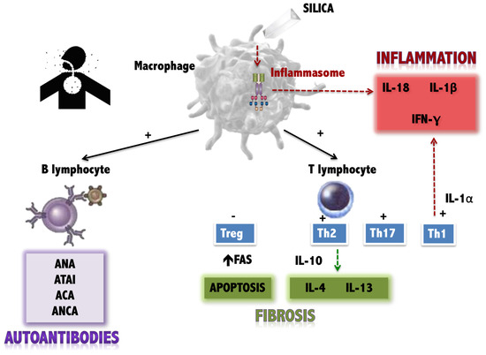 Current hypotheses about the effects of silica on the immune system. Antigen-presenting cells (such as the macrophage) are stimulated by silica, producing three types of effects on the immune system: (1) Stimulation of the inflammasome, with the production of pro-inflammatory cytokines (IL-18, IL-1beta). (2) Stimulation of T lymphocytes (both the Th1 response, also pro-inflammatory, and the Th2 response and attenuation of regulatory T lymphocytes, which favour fibrosis. (3) Stimulation of the production of autoantibodies by B lymphocytes (own elaboration, based on data collected in [8,9,10].