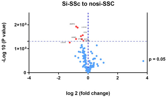 Differential proteins between si-SSc and nosi-SSc groups. SSc; systemic sclerosis; Si-SSc: systemic sclerosis patients with silica exposure; nosi-SSc: systemic sclerosis patients without silica exposure; Adipo: adiponectin; LV319: immunoglobulin lambda variable 3–19; CO2: complement C2; A2MG: alfa 2-macroglobulin; VTNC: vitronectin; ACTG: cytoplasmic actin 2; PED: pigment epithelium-derived factor; LV218: immunoglobulin lambda variable 2–18.