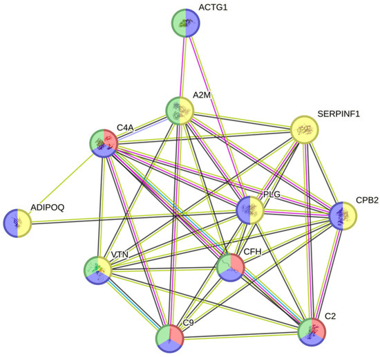 Protein Interaction Network. ADIPOQ: adiponectin; ACTG1: actin, gamma 1; PLG: plasminogen; C9: complement component 9; C2: complement component 2; C4A: complement C4-A; SERPINF1: Serpin Family F Member 1; CPB2: Carboxypeptidase B2; VTN: vitronectin; A2M: alpha-2-macroglobulin; CFH: Complement Factor H.