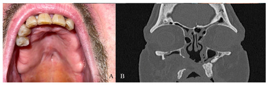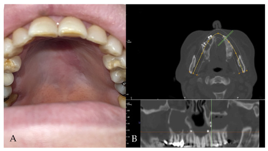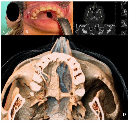 (A,B) Clinical presentation of the oro-nasal communication. In inset (A), it is possible to appreciate the collapse of the nasal pyramid. (C,D) Radiographic and 3D reconstruction using InVivo6® and Anatomage Table EDU vers.8® (Santa Clara, CA, USA) software. DICOM files were imported in InVivo6® (Santa Clara, CA, USA) software to obtain the axial, cross, and panorex sections. Afterwards, the DICOM files were imported Anatomage Table EDU vers.8® (Santa Clara, CA, USA) to obtain the 3D rendering.