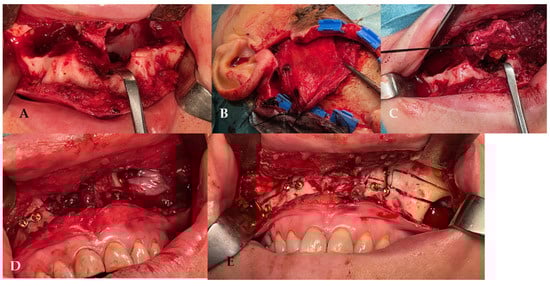 (A) The surgery was performed using a Le Fort I osteotomy preceded by preplating to achieve the correct repositioning of the fragment; a careful dissection of the nasal and palatal mucosa was performed after the down fracture. (B,C) Temporalis muscle harvesting and rotation (D,E) fixation of the maxillary fragments.