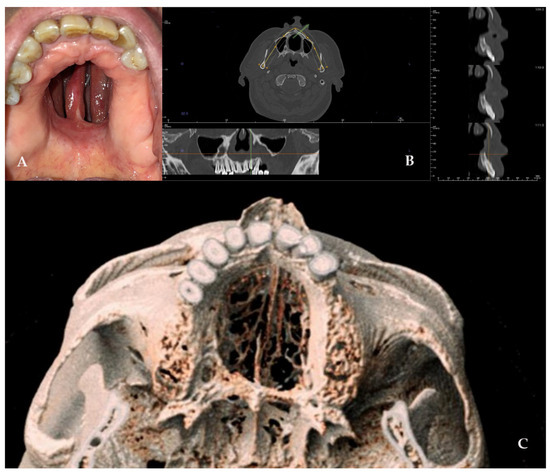 (A) Clinical presentation of the oro-nasal communication. In inset A, it is possible to appreciate the visibility of the nasal septum. (B,C) Radiographic and 3D reconstruction using InVivo6® and Anatomage Table EDU vers.8® (Santa Clara, CA, USA) software. DICOM files were imported in InVivo6® (Santa Clara, CA, USA) software to obtain the axial, cross, and panorex sections. Afterwards, the DICOM files were imported into Anatomage Table EDU vers.8® (Santa Clara, CA, USA) to obtain the 3D rendering.