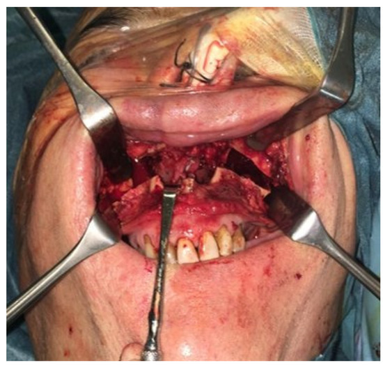 In 2022, after 2 years of sobriety, the patient underwent surgical intervention for palate reconstruction. Under general anesthesia, the surgery was performed, starting with a Le Fort I osteotomy preceded by preplating to achieve the correct repositioning of the fragment. A careful dissection of the nasal and palatal mucosa was performed after the down fracture. A temporalis muscle rotation flap was harvested on the left side (Figure 2). The operation lasted three hours in the oro-tracheal tube. A nasogastric tube was placed and kept in place for seven days with standard antibiotic and anti-inflammatory therapy. The patient was discharged after four days.